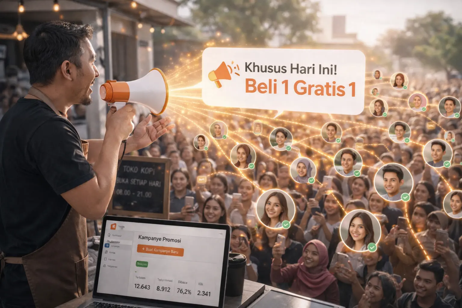 Jalankan promosi, kirim campaign ke banyak pelanggan, dan otomatis kirim pesan lanjutan ke pelanggan yang tepat.