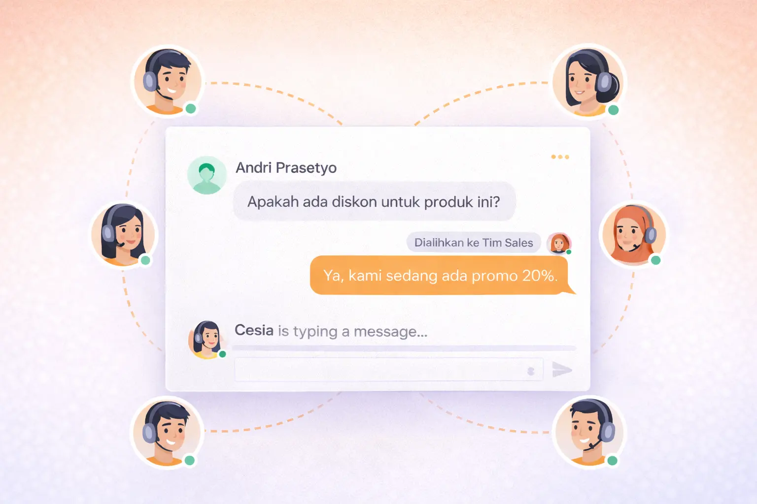 AI Agent membantu menjawab chat pelanggan, dan tim Anda bisa ikut masuk serta melanjutkan percakapan kapan saja.