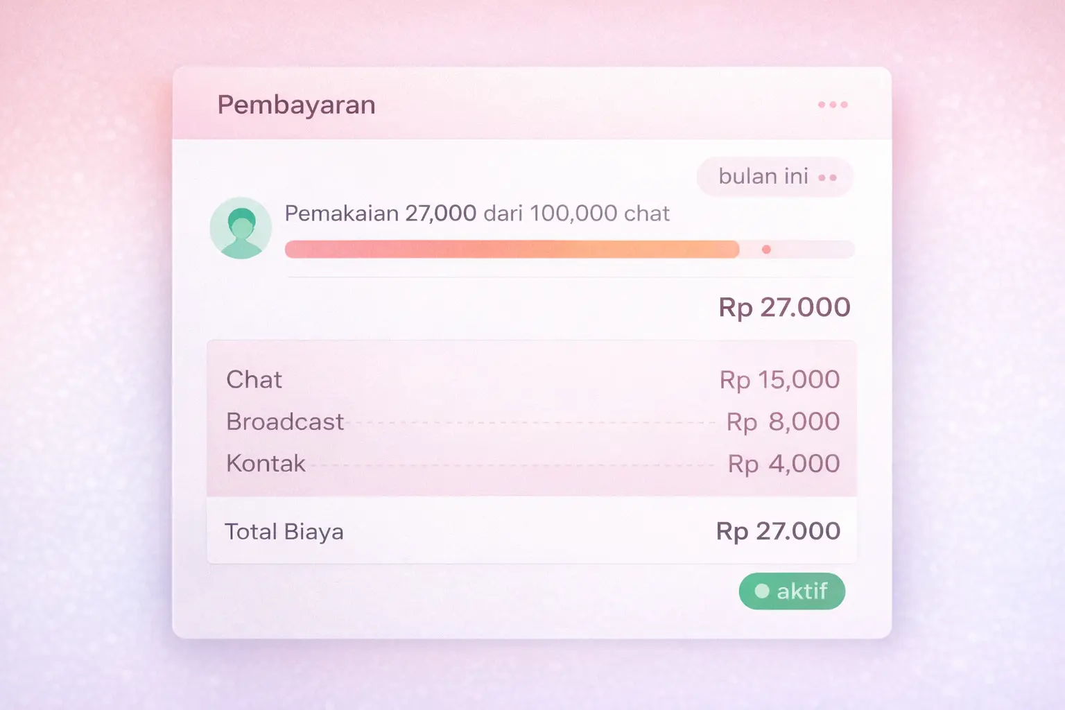 5.000 chat per bulanRata-rata bisnis online menerima 2.000–10.000 chat per bulan dari semua saluran.